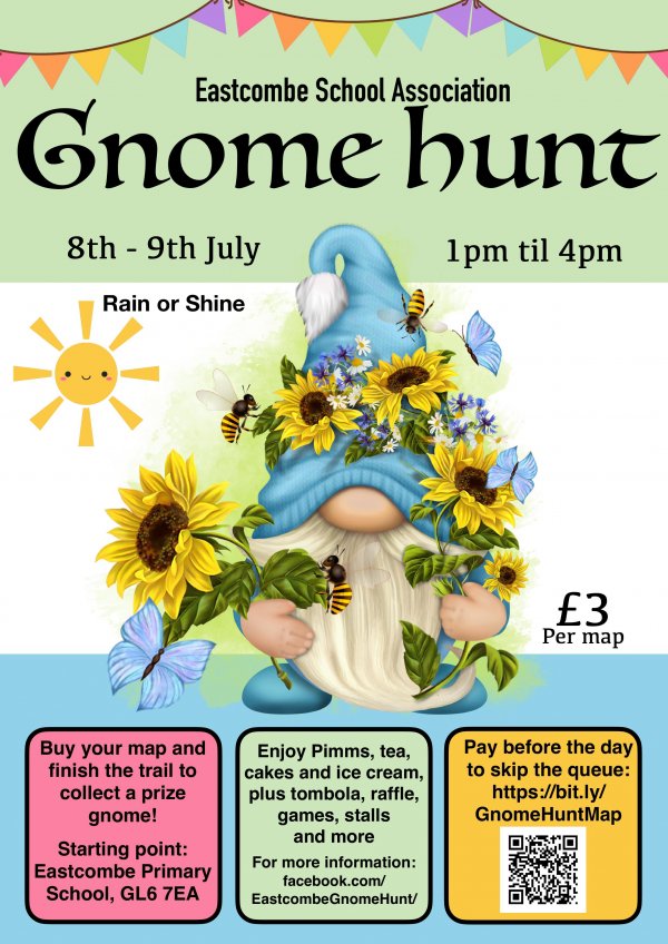 Join us for an afternoon of family fun and hunt for gnomes in the beautiful village of Eastcombe. Buy your map and finish the trail to collect a prize gnome! Enjoy tea, cakes and ice cream, plus tombola, raffle, stalls and more. Runs from 1 pm to 4 pm each day. £3 per map.
