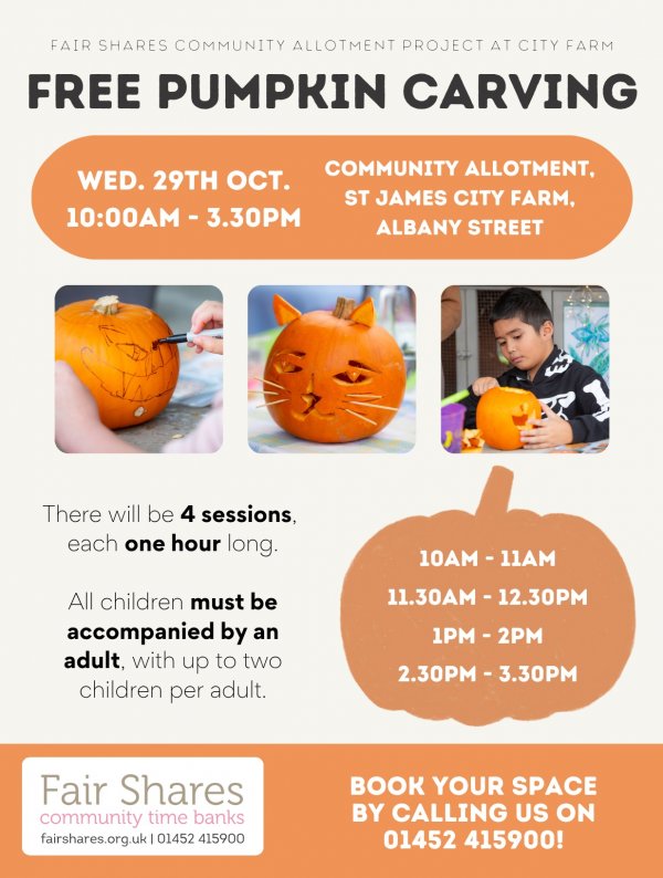 Dates: 29th October 2025 - Free Pumpkin Carving @ Fair Shares Allotment