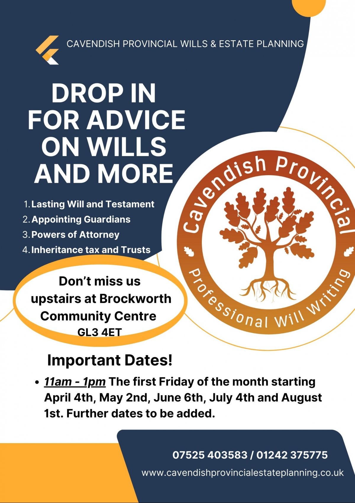 Cavendish Provincial Wills and Estate Planning will be at the Brockworth Community Centre on Friday 4th July between 11am and 1pm.