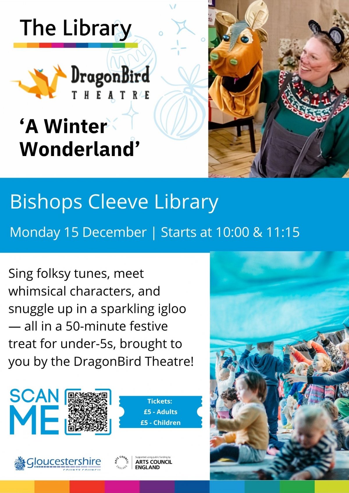 Sing folksy tunes, meet whimsical characters, and snuggle up in a sparkling igloo in this wintry adventure with DragonBird Theatre at Bishops Cleeve Library.