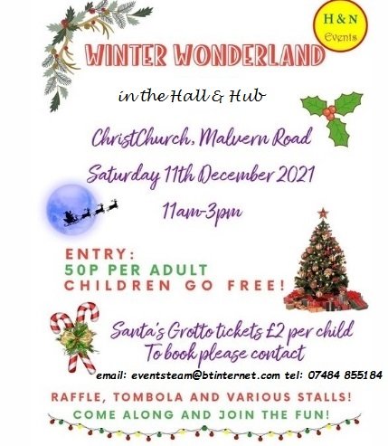 Christmas Fair with entertainment, table top sale, and Father Christmas in the Church Rooms 11am-3pm.