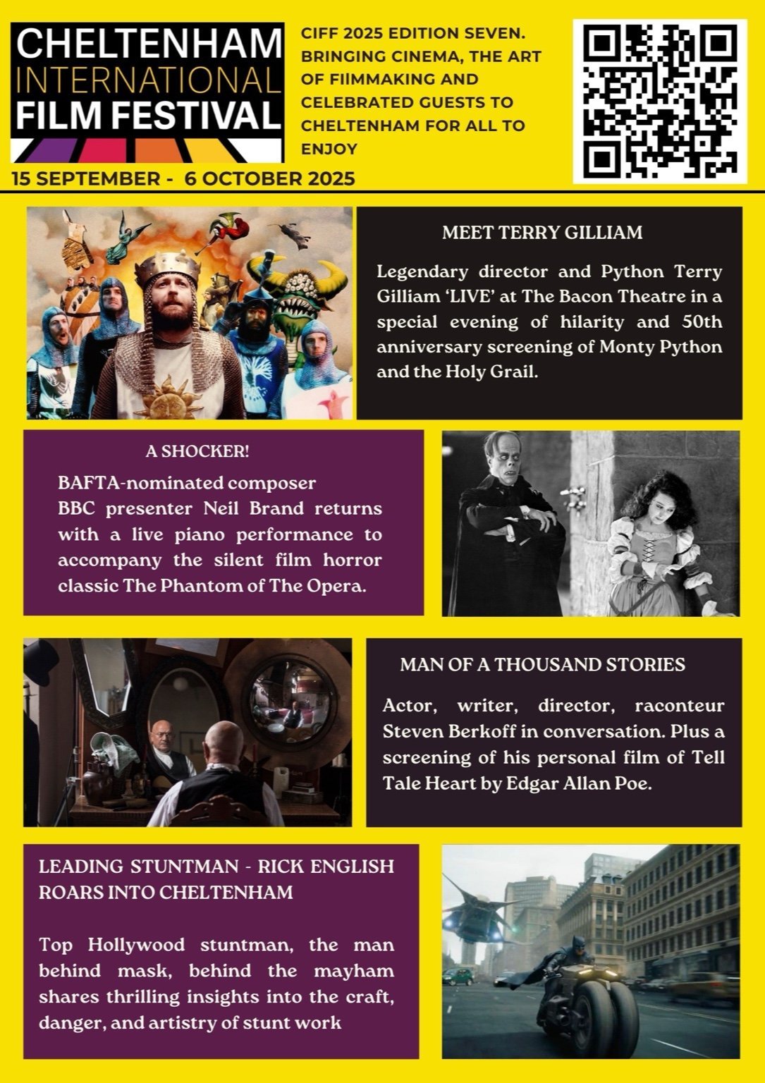 Screening films and hosting live events at The Cheltenham Playhouse - Steven Berkoff 21 September; BBC’s Neil Brand playing piano to the 100th anniversary screening of The Phantom of The Opera (1925); Top Hollywood stuntman, the man behind the mask, the man behind the mayhem, comes to the Cheltenham Playhouse - 19 September; Legendary Python, Terry Gilliam, comes to the film festival, live at The Bacon Theatre, 26 September.