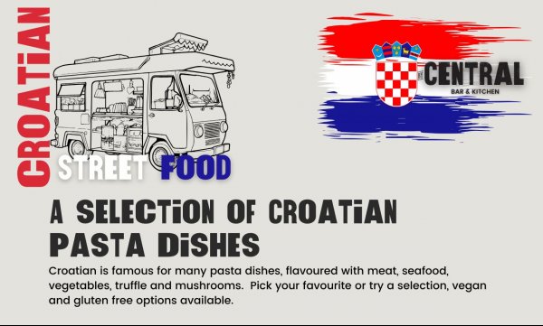 Croatian Street Food - A selection of Croatian Pasta Dishes. Croatia is famous for many pasta dishes, flavoured with meat, seafood, vegetables, truffle or mushrooms. Pick your favourite or try a selection, vegan and gluten free options available.