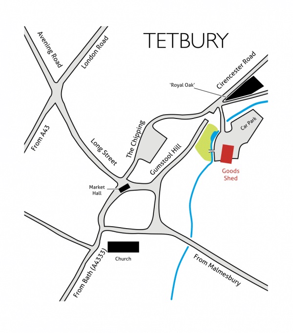 The Goods Shed is reached via Cirencester Road. From the centre of Tetbury by the Market Hall, follow the signs to the free Long Term Car Park – turn between The Snooty Fox Hotel and Quayle’s Corner House