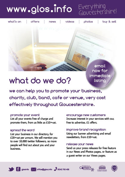 In October 2015, www.glos.info launched a completely revamped website. After many weeks of behind the scenes planning and programming, we finally got there and have gone live with the site. You will see that it is now much easier to find the different categories, such as Property, Vehicles, Directory and Events all for Gloucestershire. We would welcome your feedback, so do let us know what you think on office@glos.info.