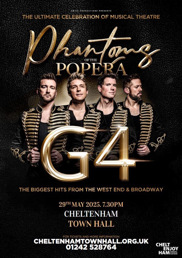 Don't Miss G4: Phantoms of the Popera! Experience the ultimate night of West End & Broadway hits with the incredible G4 at Cheltenham Town Hall on Thursday 29th May! Join the original X Factor stars on Thursday 29th May for the ultimate celebration of Musical Theatre. Expect unforgettable performances of your favourite showstoppers! Tickets are selling fast! Book yours today!