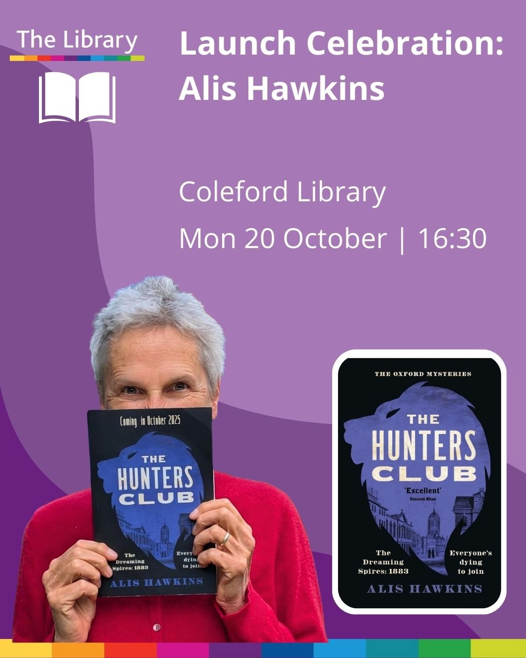 Celebrate with Alis Hawkins as she unveils the third book in her captivating Oxford Mysteries series: The Hunters Club.