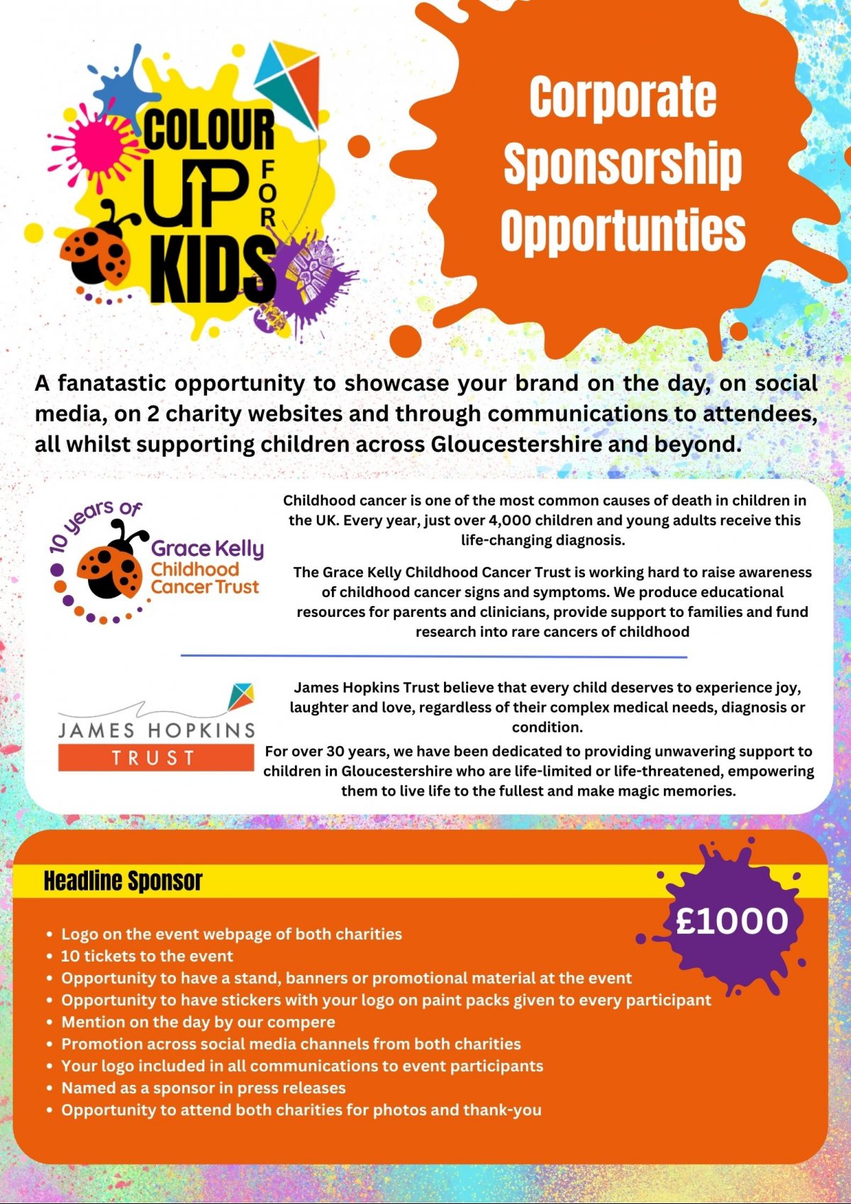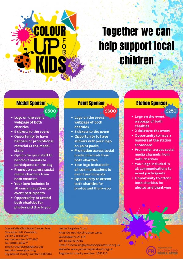 James Hopkins Trust are excited to be teaming up with Grace Kelly Childhood Cancer Trust to host a brand new event which will be coming to Gloucester for 2026, Colour Up For Kids!