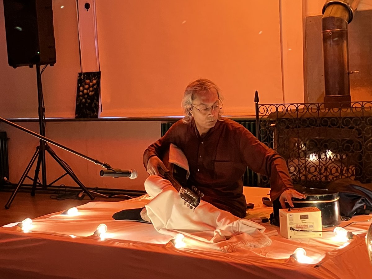 Sugato then performed. Setting his drone, he positioned himself so that his mandolin could be picked up by the mic and settled into an improvised melody, which ascended and descended, blending the Gayaki-ang with Tantrakari throughout the first half.
