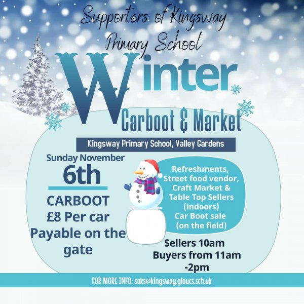 Refreshments, street food vendor, craft market & tabletop sellers (indoors) and car boot (on the field). Car boot is £8, payable on the gate. Sellers from 10AM, buyers from 11AM. To inquire or if you wish to attend as a stall holder, please email soks@kingsway.gloucs.sch.uk
