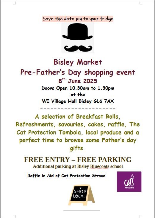 THE BISLEY ARTISAN MARKET PRE FATHERS DAY SHOPPING EXPERIENCE A PERFECT OPPTUNITY TO PICK UP SOME LOCAL HANDMADE GIFTS AND PRODUCE. SOURDOUGH, CHEESE, EGGS, DOG TREATS, HOME TEXTILES, HAIR ACCESSORIES, CAT PROTECTION RAFFLE AND TOMBOLA AND SO MUCH...