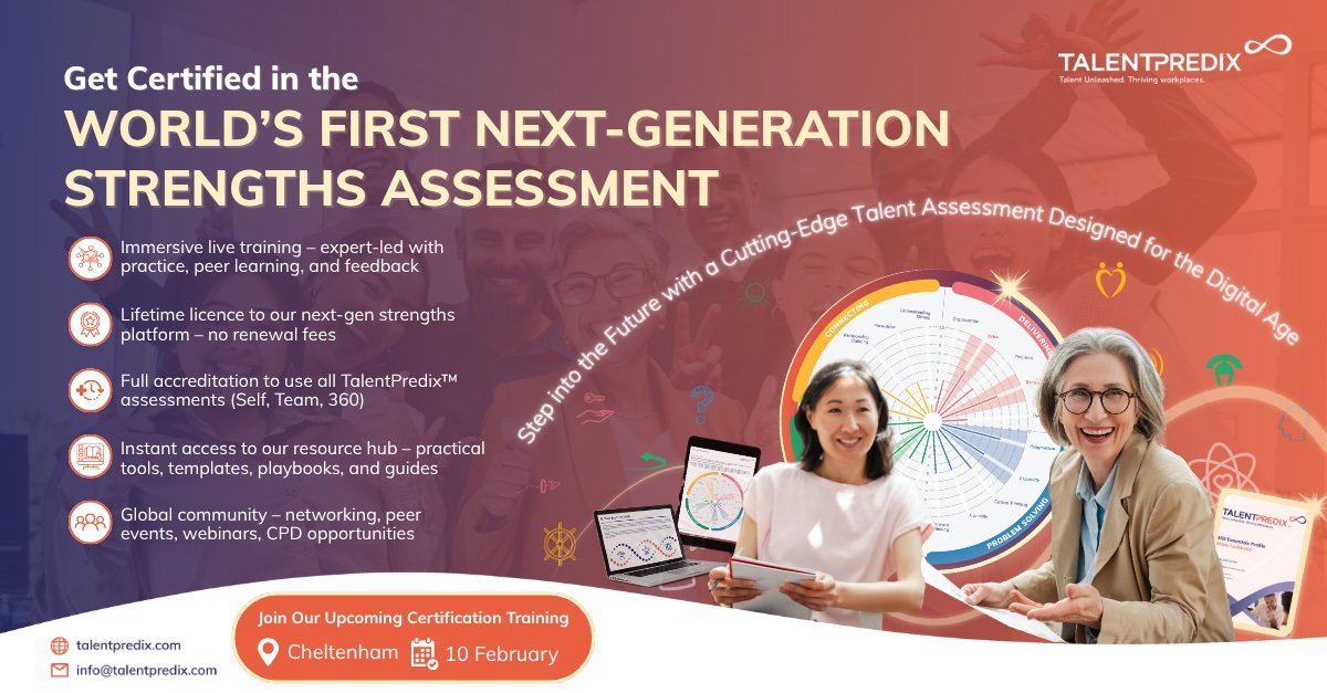 Join us in Cheltenham this February for the TalentPredix™ Strengths Practitioner Training, an interactive certification programme that helps HR, L&D, and coaching professionals unlock people’s potential and build thriving, high-performing workplaces.