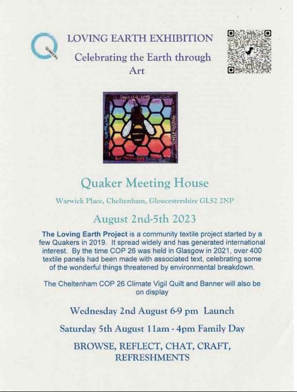 The Loving Earth Project is a community textile project started by a few Quakers in 2019. The community textile project spread widely and has generated international interest. By the time COP 26 was held in Glasgow in 2021, over 400 textile panels had been made with associated text, celebrating some of the wonderful things threatened by environmental breakdown. http://lovingearth-project.uk/