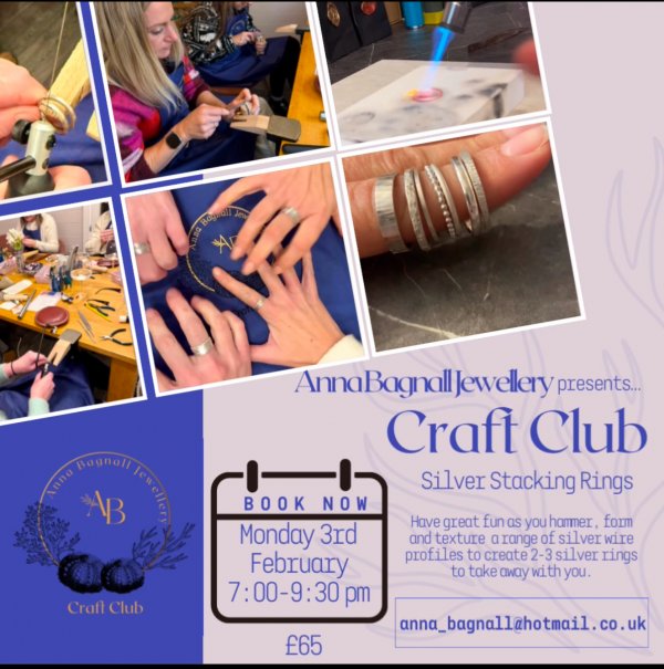 Come and join me for a relaxed, creative evening in my cosy garden studio. Have great fun as you hammer, form and texture a range of silver wire profiles to create 2-3 silver rings to take away with you. If this date doesn’t work for you, or you would like to book a private party, please email me at: anna_bagnall@hotmail.co.uk