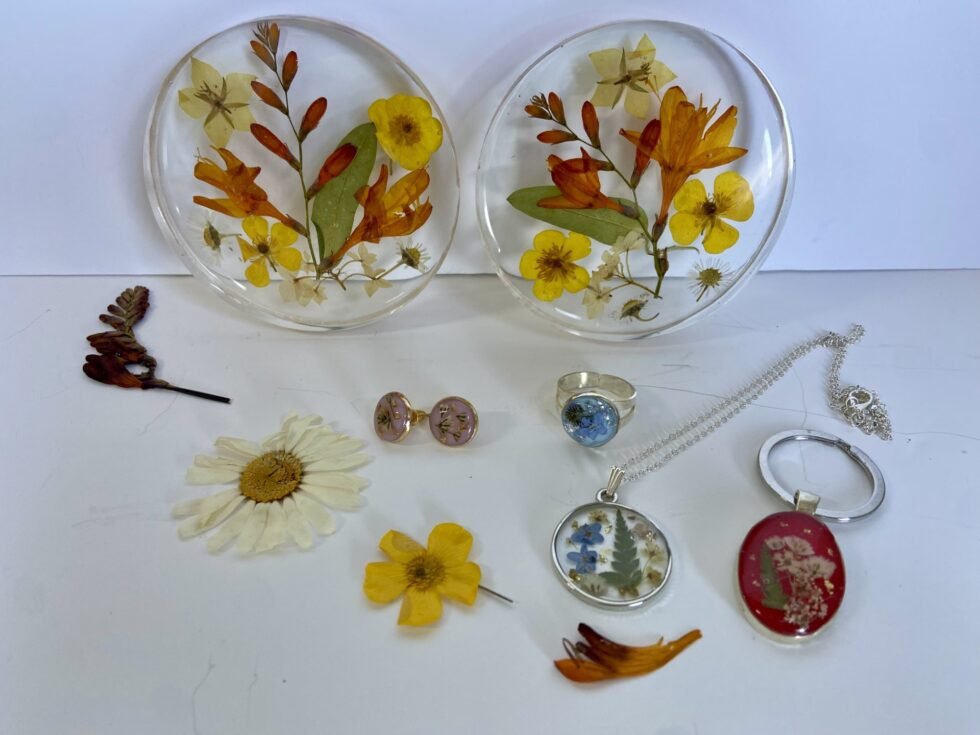 After lunch (not provided) you will get to work with another type of resin (UV) to create your very own set of jewellery – a pair of earrings (dangly or studs), botanical necklace and ring. If you would prefer to switch an item, you can choose to make a keyring, broach, different style of bookmark or keyring. These will be cured using UV LED lamps and ready for you to wear or box up and take home with you on the day.