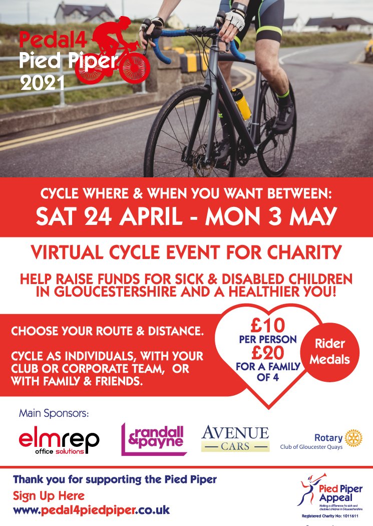 Ride between Saturday 24 April and bank holiday Monday 3 May to suit your diary. We will all be pedalling for the Pied Piper around Gloucestershire because it’s a fun, healthy, and great exercise.