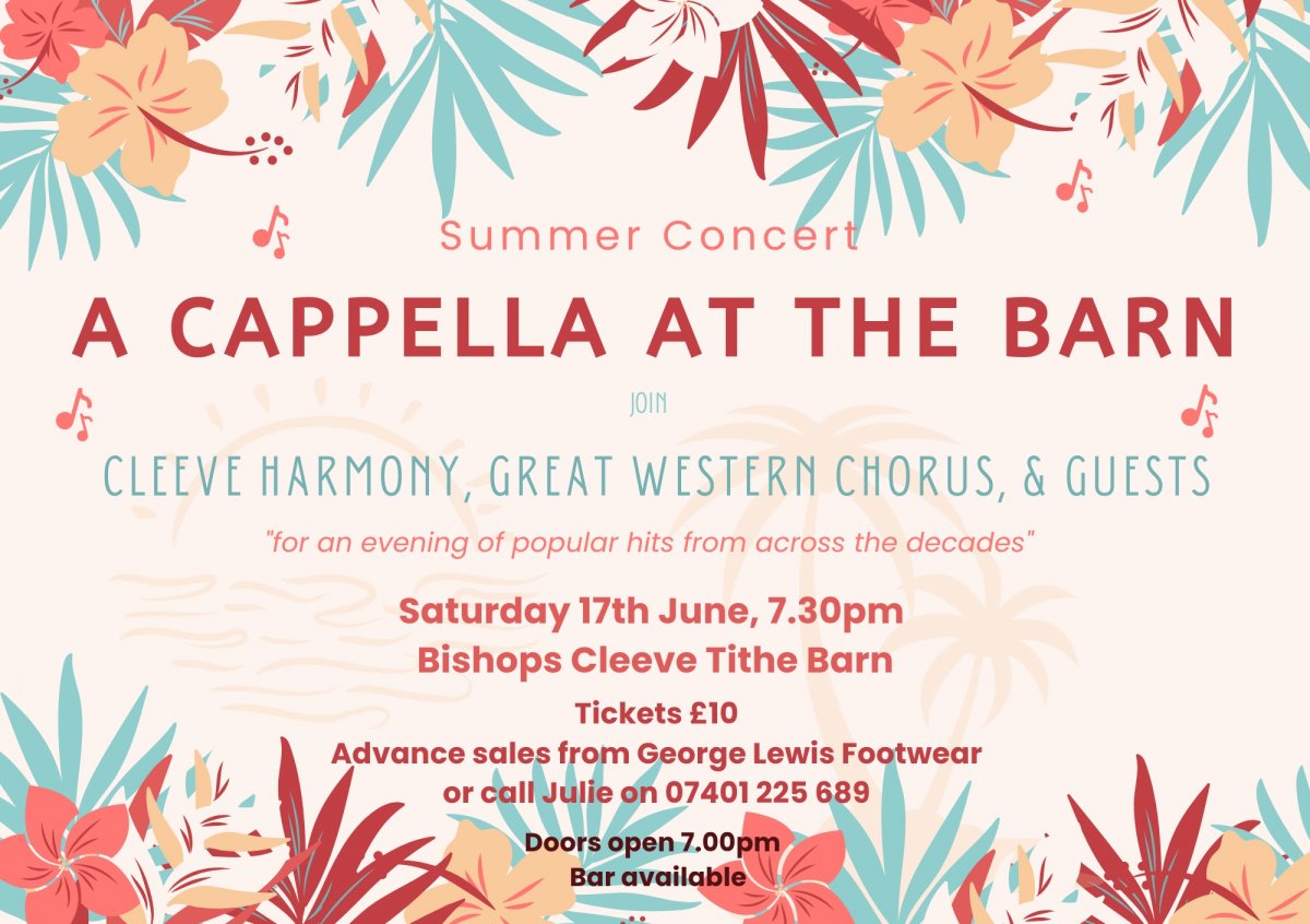 'A Cappella at The Barn' - an evening of popular hits from across the decades with two award-winning choirs; 'Cleeve Harmony' from Cheltenham and 'Great Western Chorus' from Bristol, plus guests.