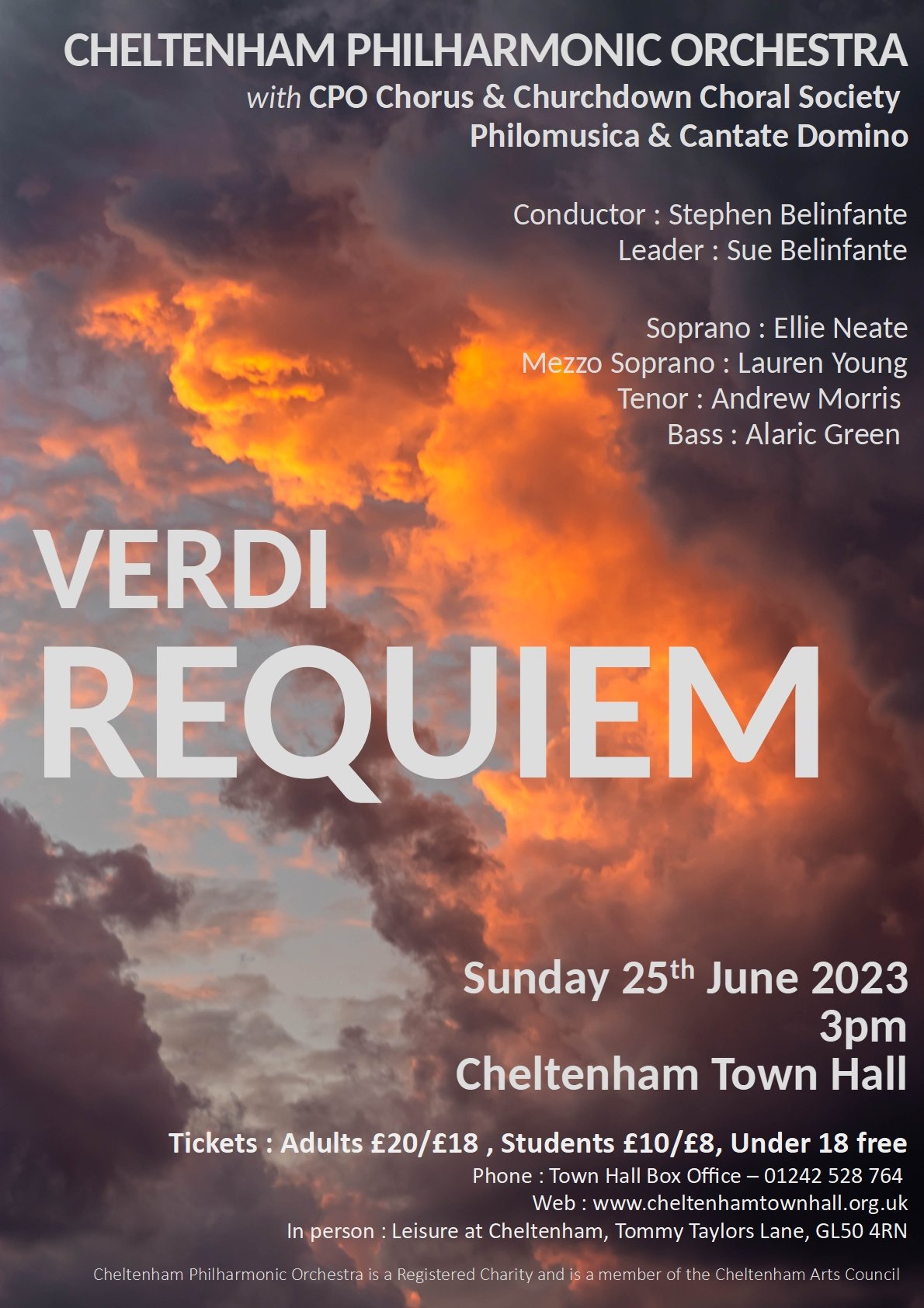 Concert details : The Cheltenham Philharmonic Orchestra presents a performance of Verdi Requiem at 3pm, Sunday 25th June 2023 at Cheltenham Town Hall. The concert features the Cheltenham Philharmonic Orchestra and Chorus, Churchdown Choral Society, Philomusica and Cantate Domino with soloists Ellie Neate (soprano), Lauren Young (mezzo soprano), Andrew Morris (tenor) and Alaric Green (bass). The performance will be conducted by Stephen Belinfante with Leader Sue Belinfante.