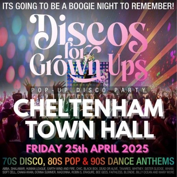The legendary DISCOS FOR GROWN UPS pop-up disco party is coming back to Cheltenham Town Hall on Friday 25th April 2025 for another boogie night to remember!