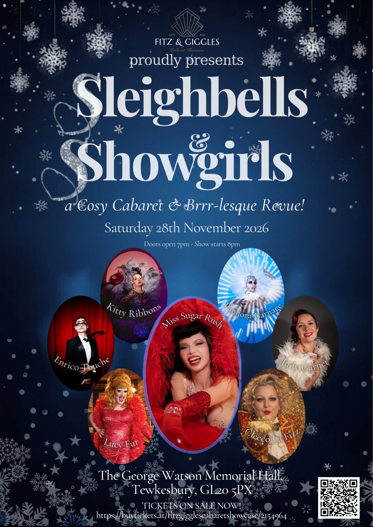 On Saturday 28th November 2026, the George Watson Memorial Hall, Tewkesbury, will be transformed into a winter wonderland of glittering glamour and cheeky charm. Expect a frosty feast of burlesque, cabaret, and comedy that will warm your heart and tickle your festive spirit.
