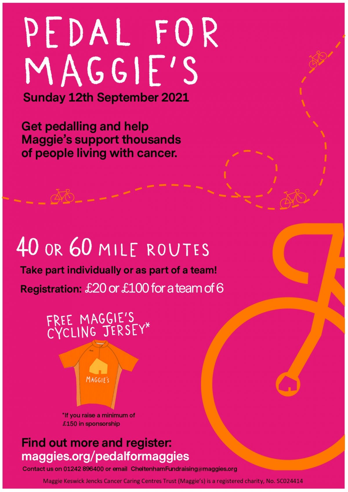 All funds raised through the £20 registration fee and optional fundraising will be used to help Maggie’s support people living with cancer and their families and friends. Participants can register online before the event at www.maggies.org/pedalformaggies; the ride kicks off 8am on Sunday, 12th September at the Maggie’s in Cheltenham Centre.