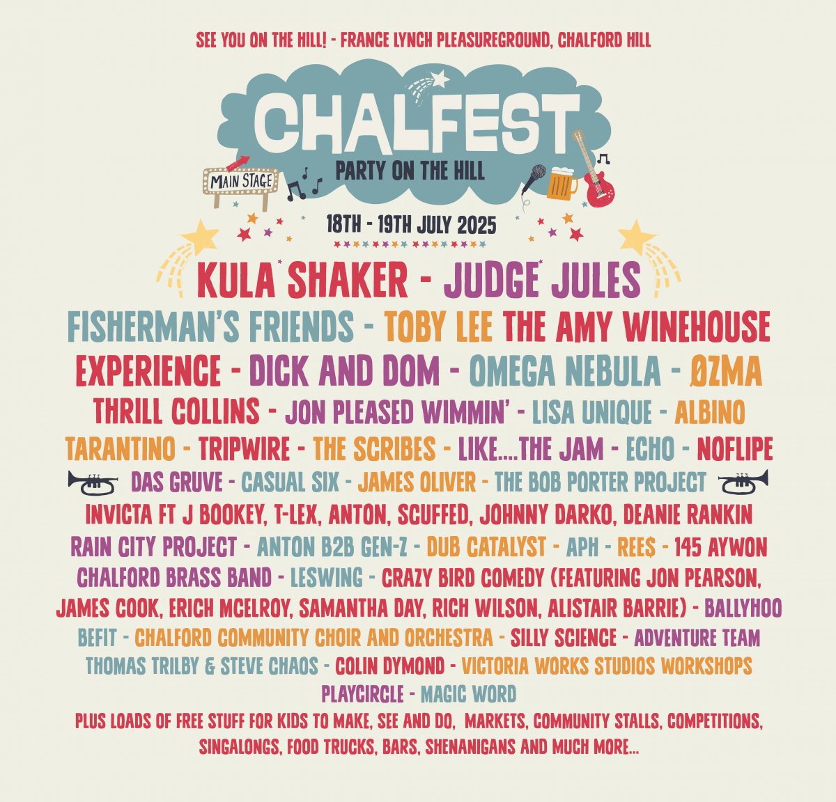 We are delighted to announce that the wonderful Kula Shaker will be headlining Chalfest, ably supported by Fisherman's Friends, Judge Jules, The Amy Winehouse Experience, Toby Lee, Ozma, Omega Nebula, Thrill Collins, Albino Tarantino and of course Dick & Dom plus so many more...