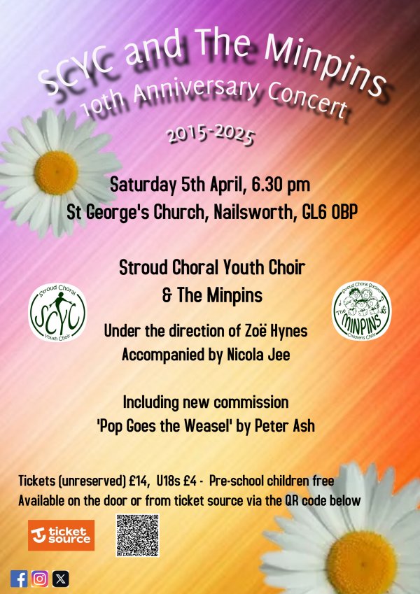 Founded in 2015 as the children’s branch of The Stroud Choral Society, The Minpins were formed to perform the children’s choruses of the Stroud Choral Society commission ‘The Pelicantata’. In 2017 the Stroud Choral Youth Choir (SCYC) were formed so that those who were too old to be Minpins could carry on singing. This concert celebrates 10 years of the choir going from strength to strength and over 40 young singers will entertain you with a variety of music from many different genres. The talent of these young people is also celebrated with several instrumental and vocal solo pieces.