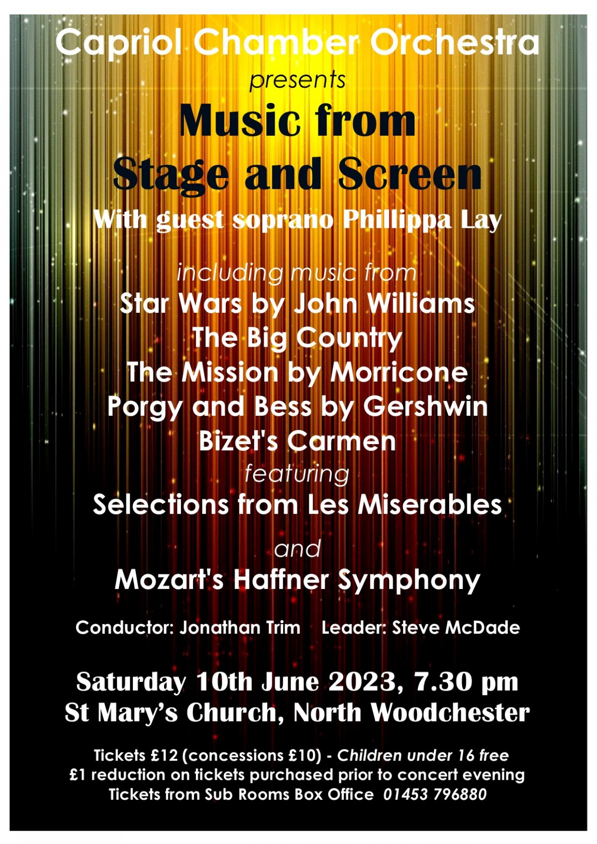 The Capriol Chamber Orchestra is delighted to be celebrating stage and screen with our guest soprano Phillipa Lay on Saturday 10th June at St Mary’s Church, North Woodchester at 7.30pm.