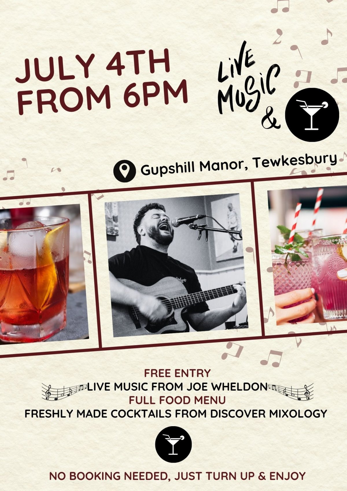 Live music from Joe Wheldon, freshly made cocktails from Discover Mixology. Food available to order. Free entry. Hosted in a lovely Gloucestershire pub with outside areas and ample parking. Beers, wines and soft drinks are also available. No need to book, just turn up from 6 pm.