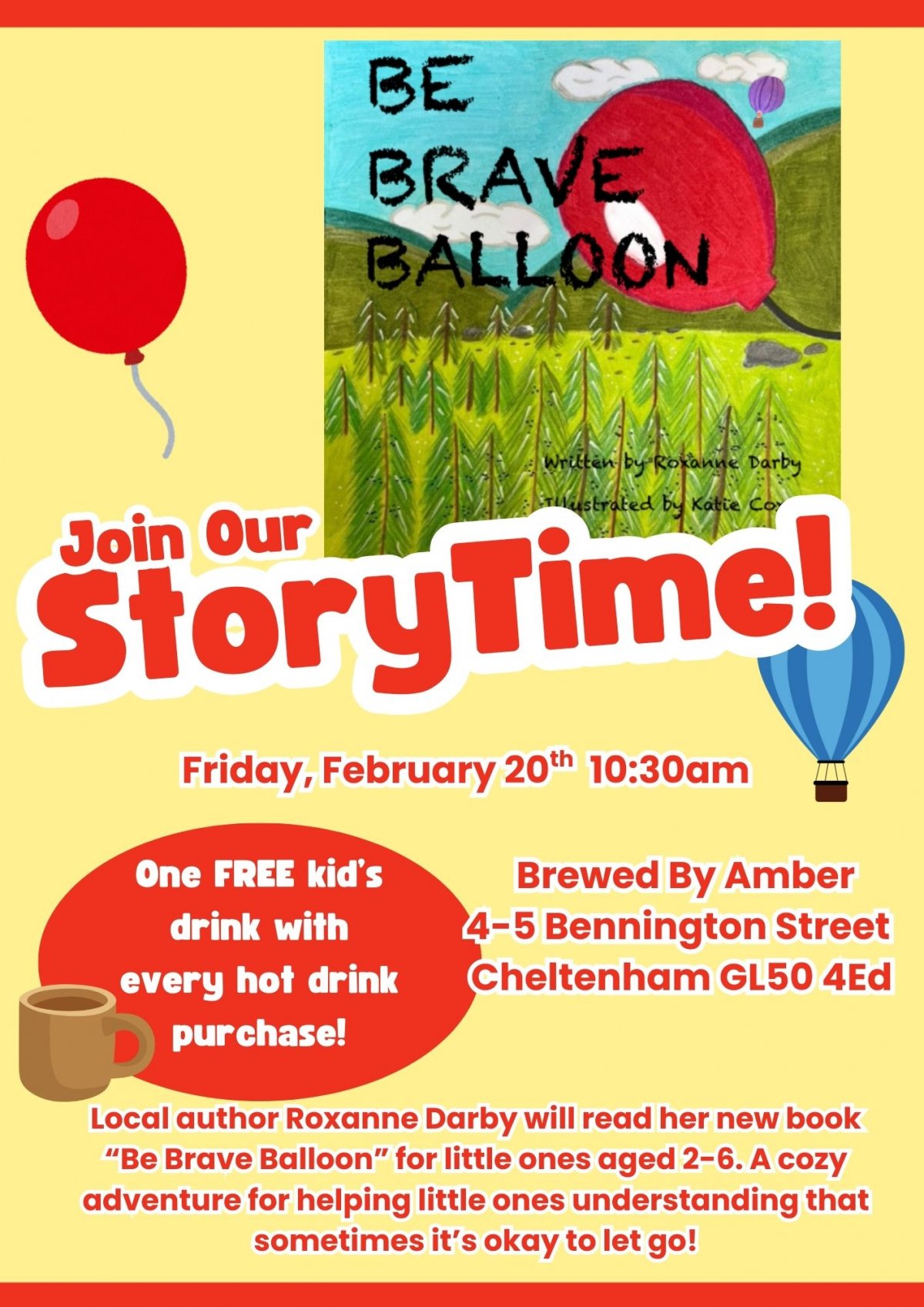 Join local author Roxanne Darby at Brewed By Amber for a reading of her new book "Be Brave Balloon" for little ones aged 2-6, a cozy adventure for helping little ones understand that sometimes it's okay to let go! One free kid's drink with every hot drink purchased!