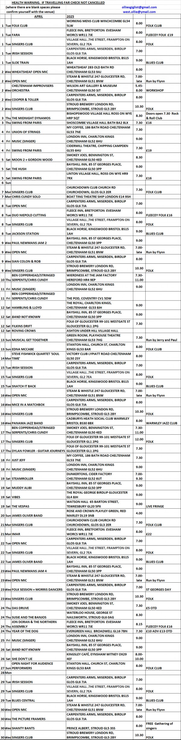 Ollie's Gig List April 2025