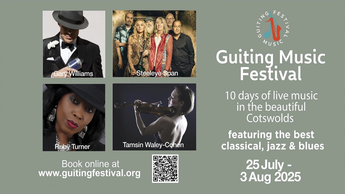 Once again, artists across many musical genres are coming to the picturesque village of Guiting Power. Performers include folk legends Steeleye Span, Ruby Turner, Britain’s Queen of Soul-Gospel and vocalist with Jools Holland Orchestra, Ronnie Scott’s All Stars direct from the famous jazz club, the fabulous classical violinist Tamsin Waley-Cohen, the Trio Meister Trio with a brilliant programme for clarinet, viola and piano, the two pianos and four hands of Simon Callaghan and Hiroaki Takenouchi, the Montenegrin Guitar Duo, Roberto Pla and his Latin Ensemble with their pulsating rhythms and The Cinelli Brothers, the UK’s 2024’s Blues Band of the year.