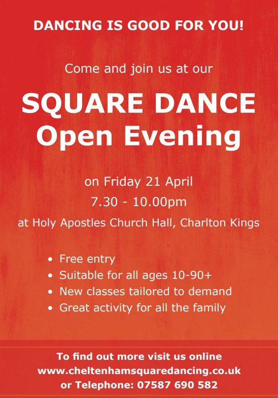Any dancing is good for your health. Square Dancing is great pastime for anyone aged between 10 and 90+. You can have 2 left feet, be fit, agile or not, so there are no excuses not to find out more! More details on our website but come and find out in person why square dancing might open up new opportunities for you. Singles, Couples, Families welcome.