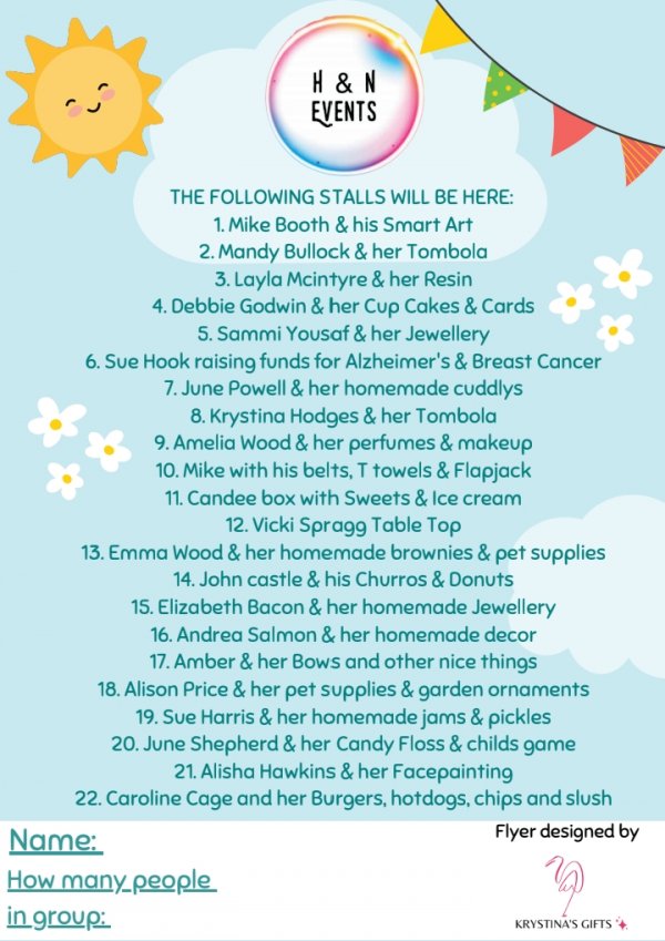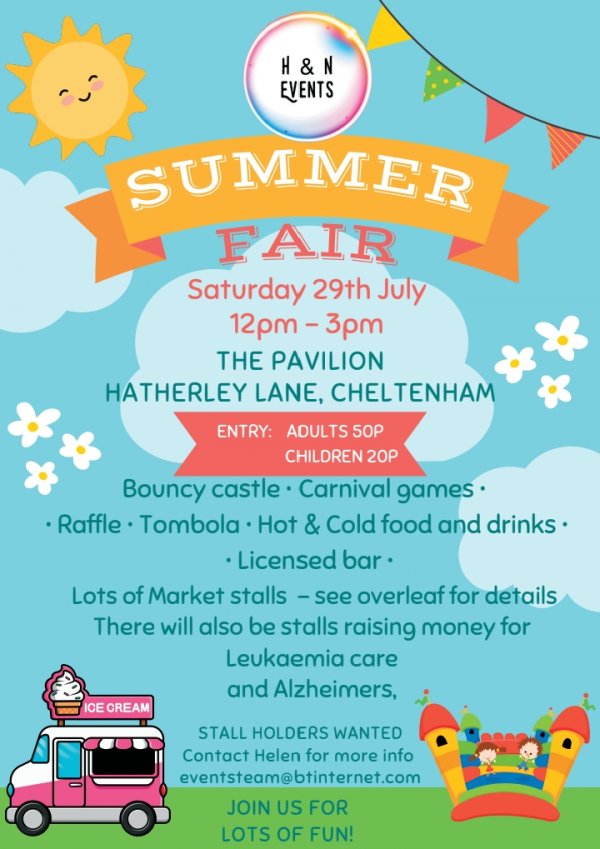 Summer fair with lots of stalls, private and also charity stalls, children's games and hot and cold food also a licensed bar. We still have room for more stalls nd we are hoping to get Fair Rides we really could do with sponsorship but no joy there yet