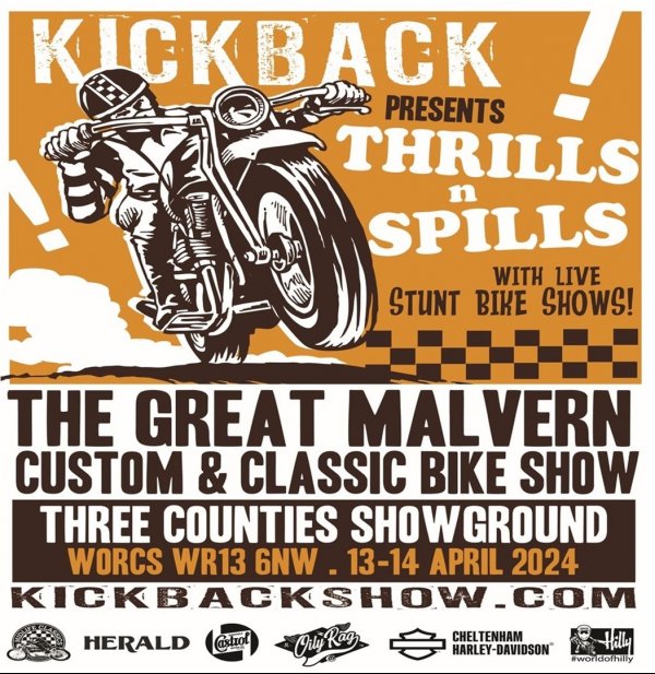Kickback presents The Great Malvern Motorcycle Festival. Including custom show, classic bike exhibition, stunt bike performances and the 2024 National Championships - Builders' Builder Awards.