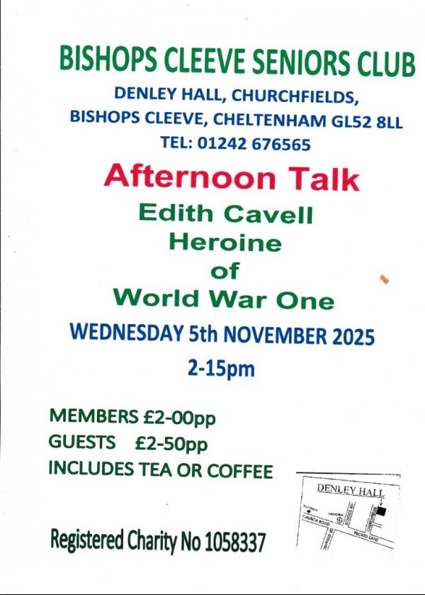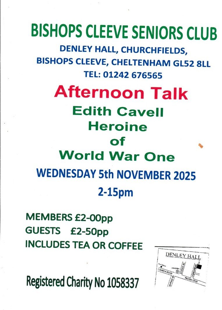 Afternoon Talk, Edith Cavell, Heroine of World War One at 2.15pm.